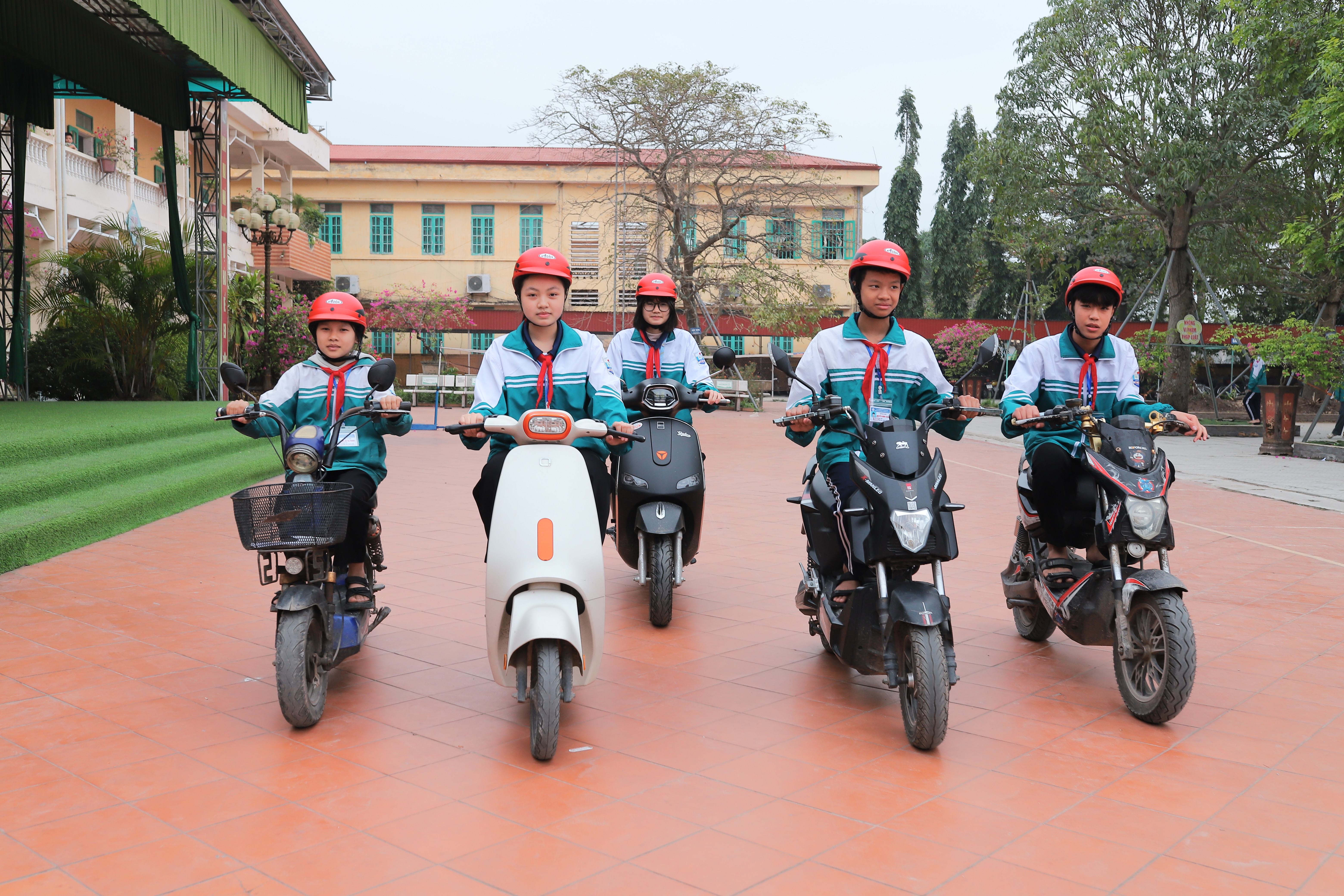 Học sinh luôn đội mũ bảo hiểm khi tham gia giao thông