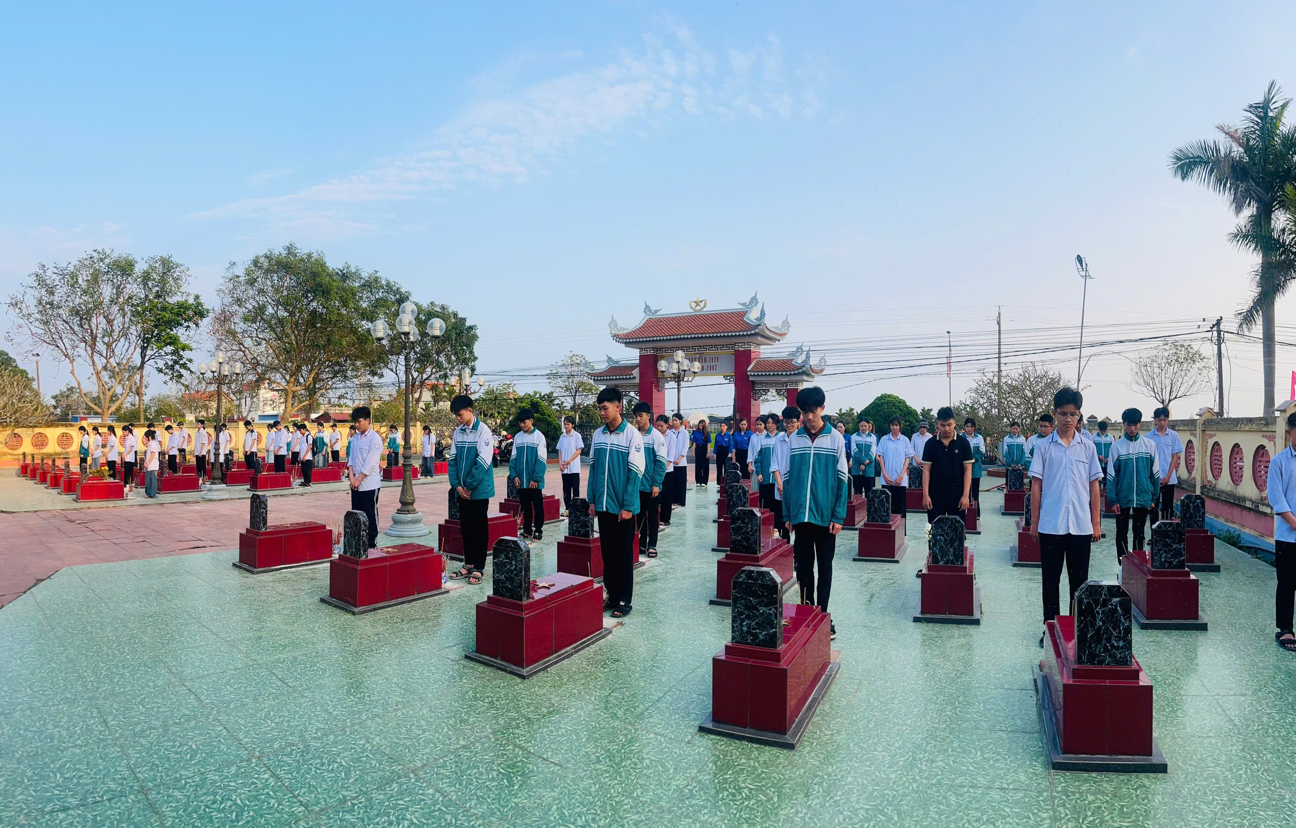 Ngay sau những giờ học lý luận, tinh thần xung kích của tuổi trẻ Hải Xuân đã được cụ thể hóa bằng hành động thiết thực. Dưới cái nắng hanh vàng của những ngày tháng Ba, màu áo trắng học trò hòa cùng màu áo xanh tình nguyện đã làm bừng sáng không gian Nghĩa trang Liệt sỹ xã Hải Xuân. Với tinh thần “Uống nước nhớ nguồn”, các em học sinh và đoàn viên nhà trường đã hăng hái tham gia dọn dẹp vệ sinh, cắt tỉa cây cảnh và lau chùi từng phần mộ liệt sỹ. Những giọt mồ hôi lăn dài trên má nhưng không làm mất đi những nụ cười rạng rỡ của sự sẻ chia. Mỗi nén tâm nhang dâng lên là một lời hứa của thế hệ trẻ: Sống, học tập và lao động sao cho xứng đáng với sự hy sinh của các thế hệ cha anh.