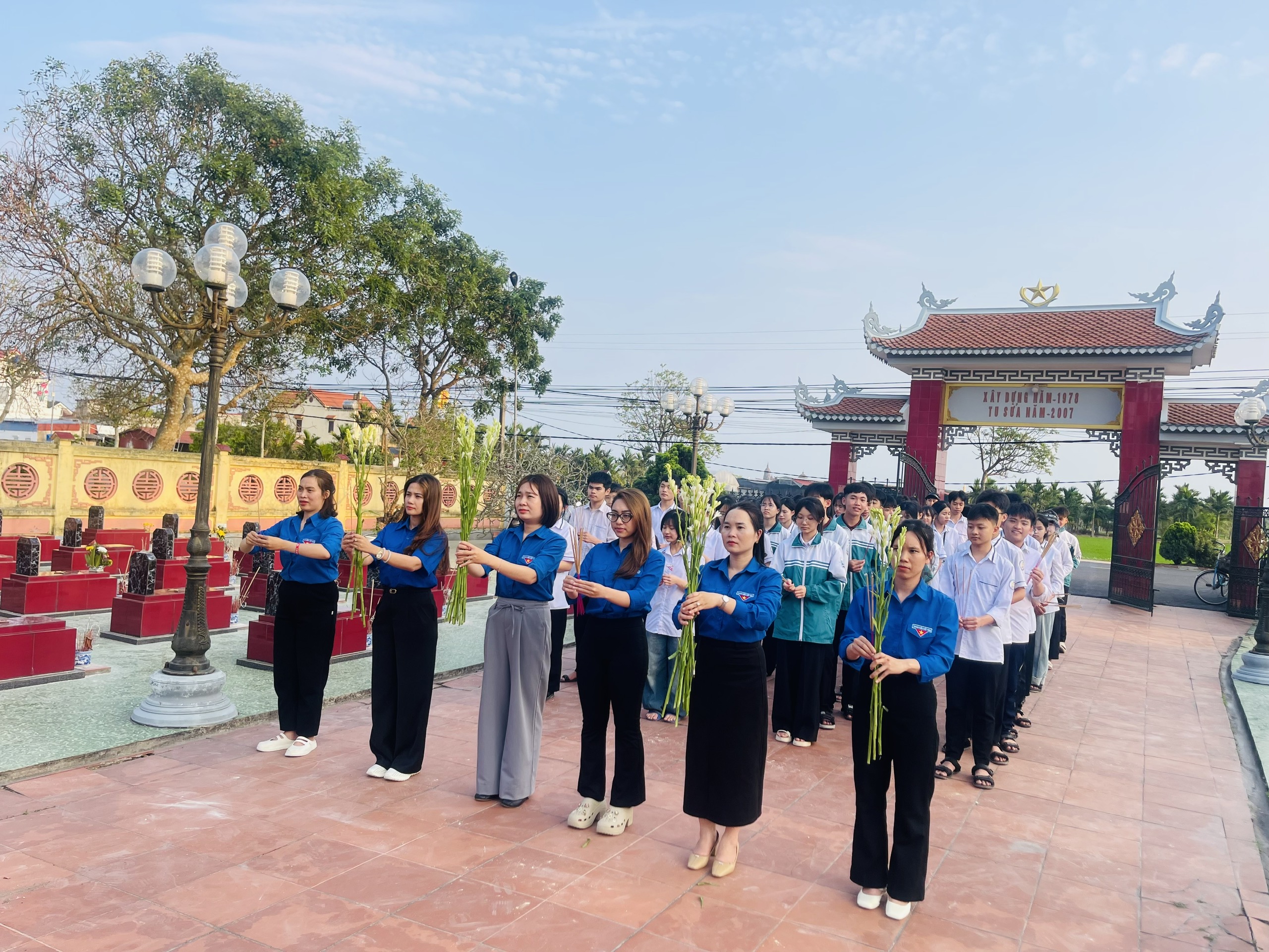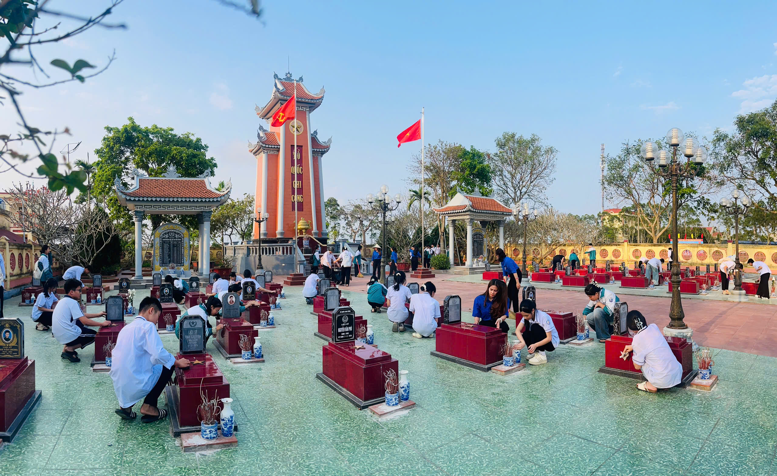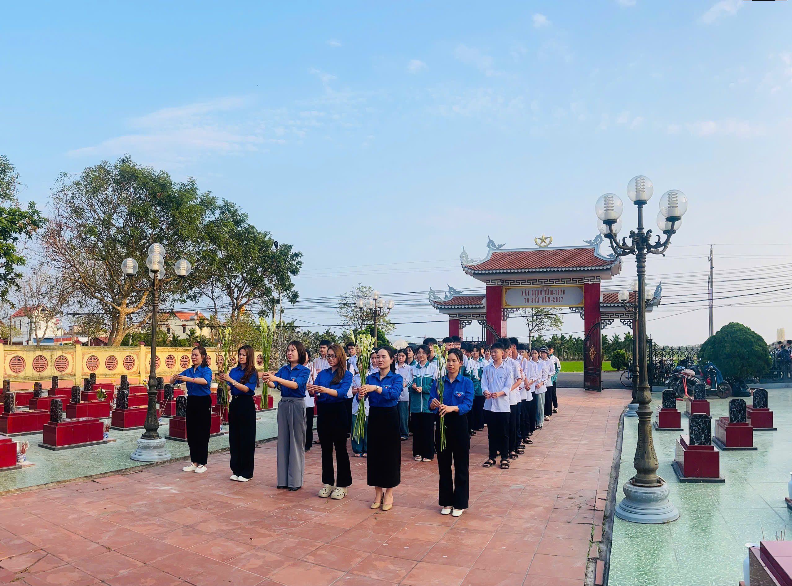 Ảnh: Đoàn viên và học sinh khối 9 tham gia vệ sinh tại nghĩa trang liệt sỹ